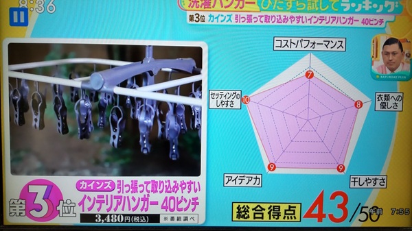 それでいよいよ本日買いに行こうという決意を固め、こういう日常の生活の物を買う際、私はTBSサタデープラスの「ひたすら試してランキング」を参考にしていて、バニラアイスはスーパーカップ超バニラを食べ、夏のフルーツアイスはサクレレモンを食べたのであるが、今年の6月19日の放送では「洗濯ハンガー」が取り上げられたので、その際のランキングを参考にしようとVを見返したのである。