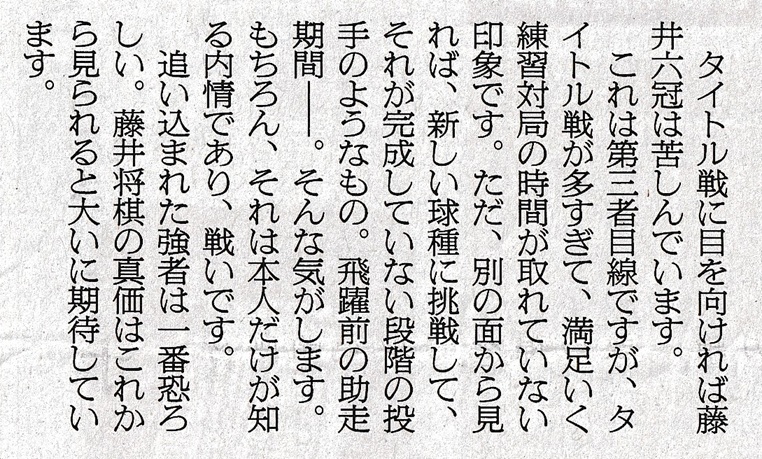 3月13日。W防衛を果たすには残り4局の勝負を1つも落とさずに勝ち続けなければならない。しかも超タイトなスケジュール。そんな時点での朝日新聞、杉本昌隆師匠の連載コラムより: