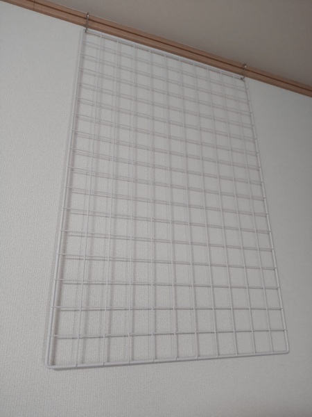 そういうわけで、自室の壁面にむりやりワイヤーネットを垂らすのであった。